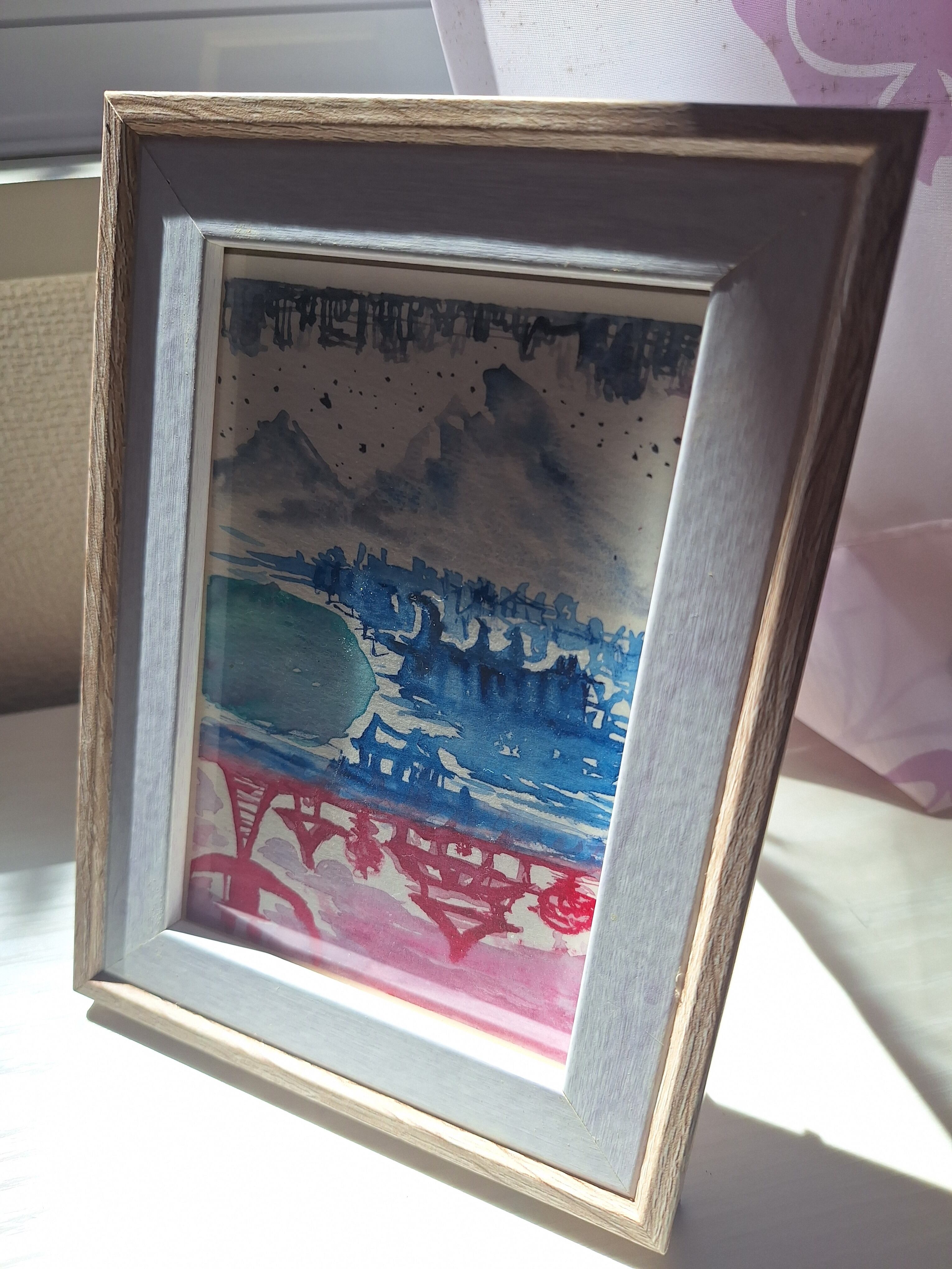 ポストカードサイズの原画には既製品の簡易的なフレームが付属します。